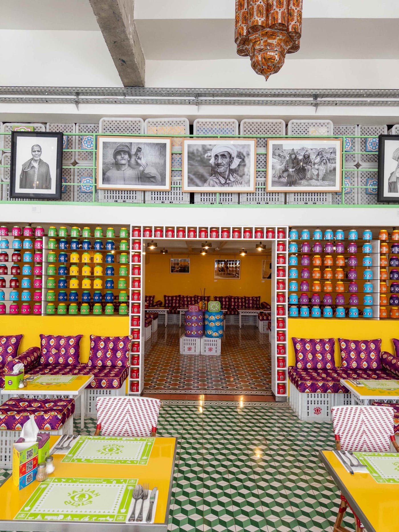 Jajjah is his name spelled backward, and also the name of both his tea brand and the concept space he opened at 114-116 Rue Sidi Ghanem. The space operates simultaneously as cafe, boutique, and gallery: tea is brewed, Moroccan food is served in Hajjaj's visual language, objects and prints are sold, and exhibitions rotate through the gallery section. A recent collaboration with Atay Atelier, the "Cross Lens" exhibition, brought together eight emerging artists from Morocco and the Netherlands to address cultural identity through photography, which is as clear an illustration as any of how Hajjaj uses the space: as a platform for the kind of international artistic exchange that shaped his own practice in its early years.