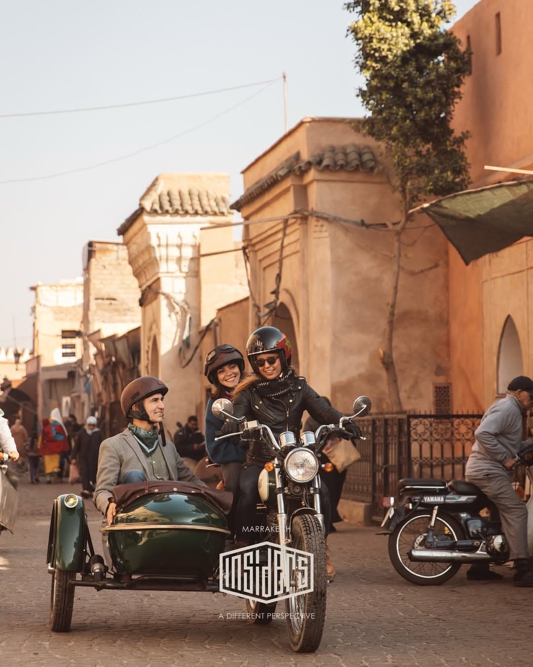 Marrakech Insiders operates with a precise proposition: a vintage sidecar motorcycle, a local guide, and a city seen at low speed. Tours are fully private and move through the medina, the Palmeraie, or further depending on the route chosen. The format combines time in the vehicle with walking moments, which means the sidecar is the context and the on-foot segments are the focus.