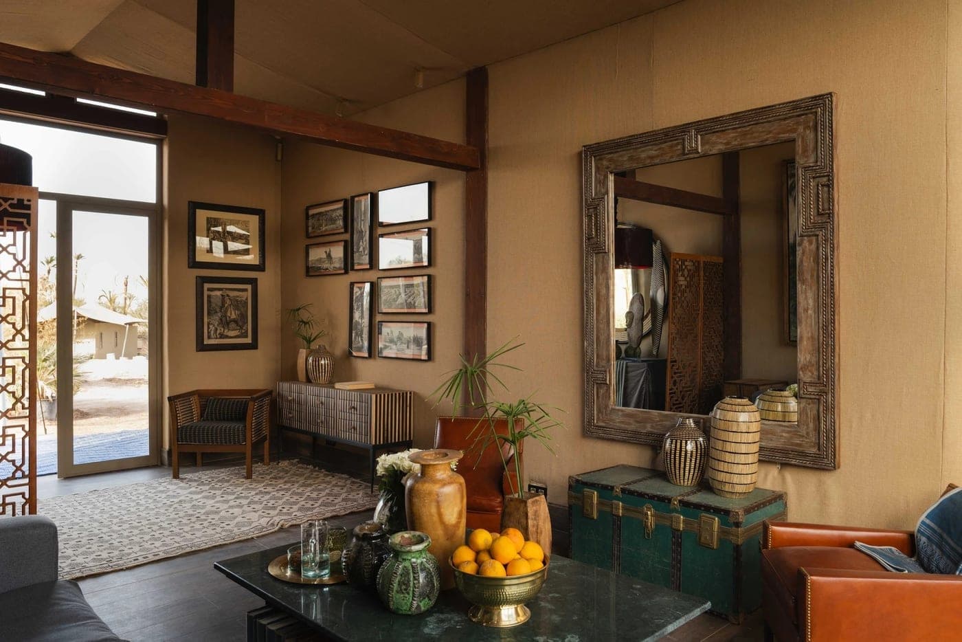 At the edge of Jnane Tamsna's nine-acre estate, a small camp sits between two landscapes that, in Marrakech, rarely touch: the density of an oasis garden and the open quiet of desert land.