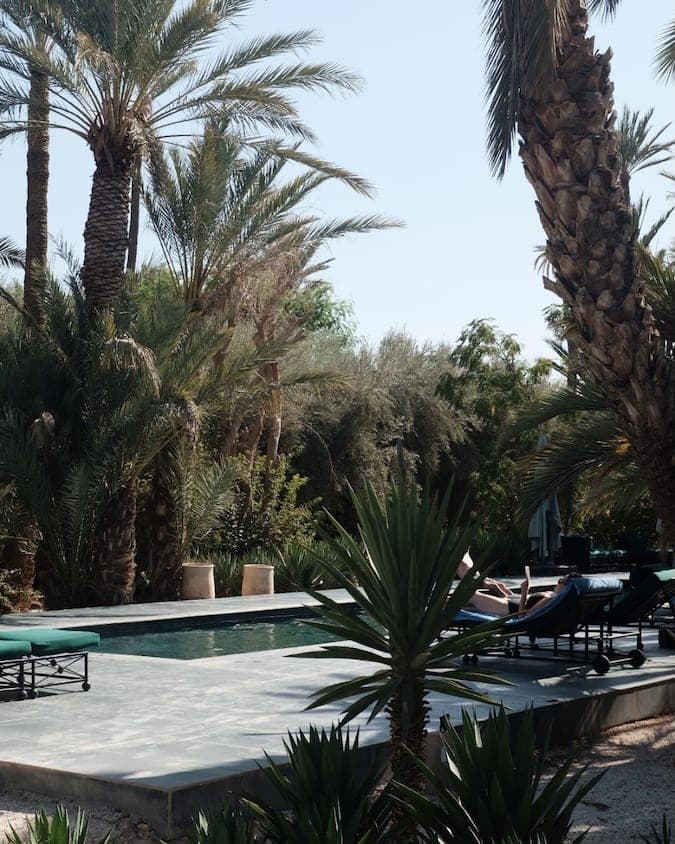 The nine-acre garden, designed by Gary Martin, is where the hotel's character coalesces. This is not a landscaped collection of specimens but rather a working ecology, a space where plant knowledge and local practice inform every row, every shelter, every watering strategy. The garden breathes with the rhythm of the Palmeraie itself. Paths wind through fruit trees and flowering plants in patterns that recall traditional Moroccan gardens without mimicking them exactly. Five pools are scattered across the property, each one positioned to feel discovered rather than announced, each drawing its definition from the vegetation that surrounds it.