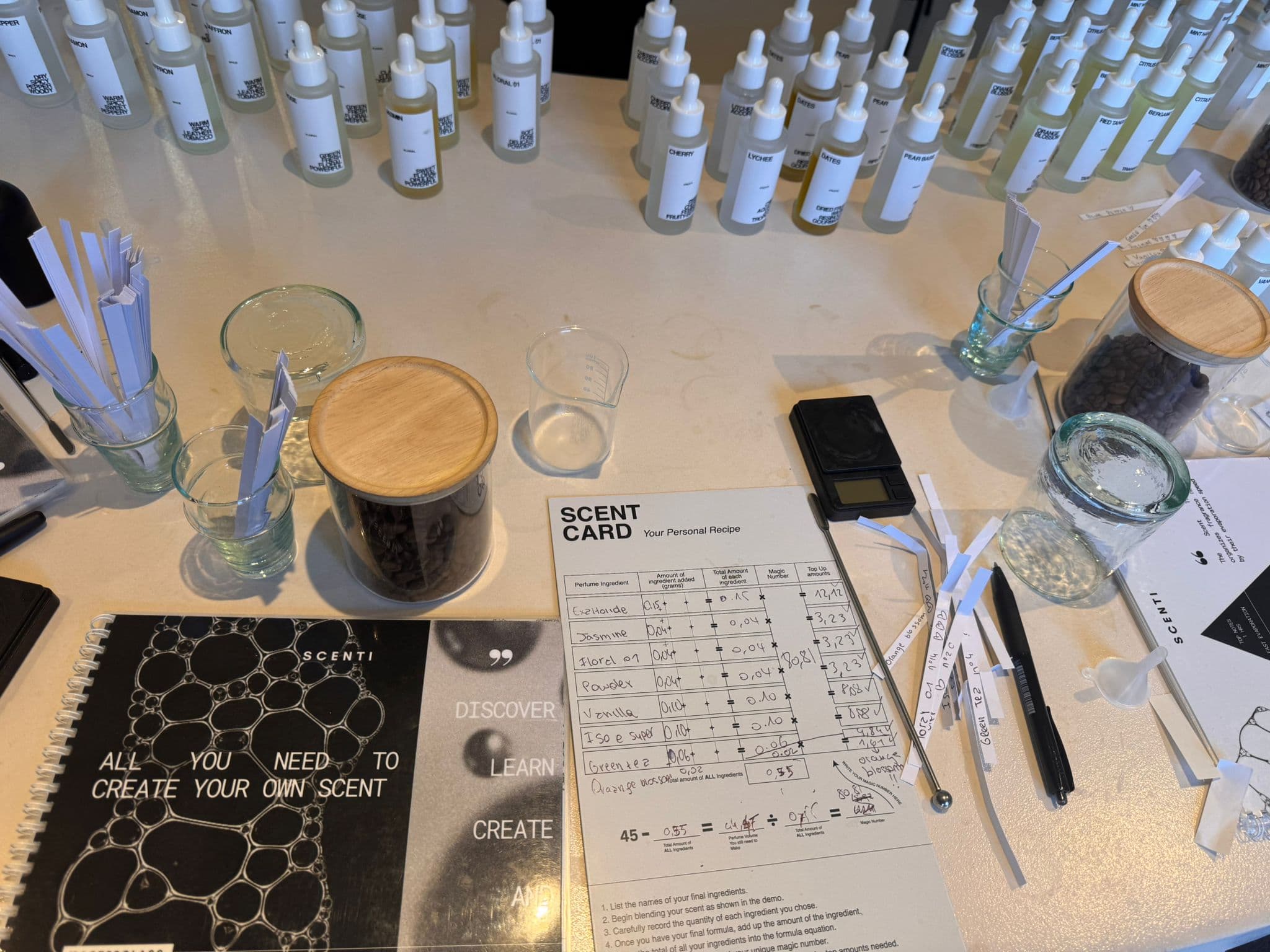 Each participant leaves with a fifty-millilitre bottle of their bespoke fragrance and a personalised recipe card. It is not a souvenir. It is something of your own, made entirely from your own choices, in a room that gave you the tools and the vocabulary to make them.